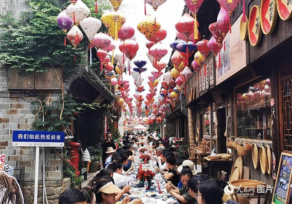 5月19日,寧波市寧??h前童古鎮(zhèn)豆腐節(jié)長(zhǎng)桌宴,吸引八方來(lái)客。人民網(wǎng) 章勇濤攝