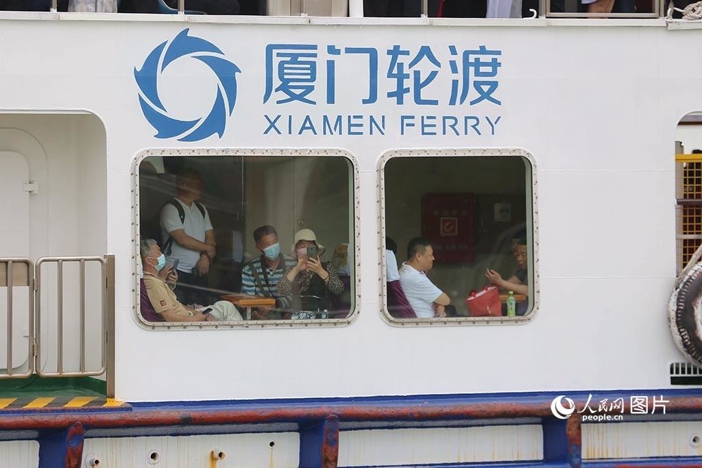 5月14日,廈門(mén)輪渡船??抗睦藥Z內(nèi)厝澳碼頭,船艙里的游客迫不及待地拿起手機(jī)拍照。人民網(wǎng)記者 陳博攝