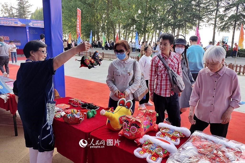 5月14日,“中國(guó)旅游日”主題周活動(dòng)期間,河南省三門(mén)峽市陜州區(qū)在黃河岸邊舉辦“傳承多彩非遺”魅力陜州非物質(zhì)文化遺產(chǎn)展演體驗(yàn)活動(dòng),大展傳統(tǒng)藝術(shù)魅力,為群眾獻(xiàn)上了一場(chǎng)“非遺文化盛宴”。在活動(dòng)現(xiàn)場(chǎng),當(dāng)?shù)厥〖?jí)非遺傳承人向游客展示文創(chuàng)產(chǎn)品布老虎。人民網(wǎng)記者 王玉興攝