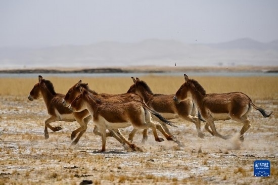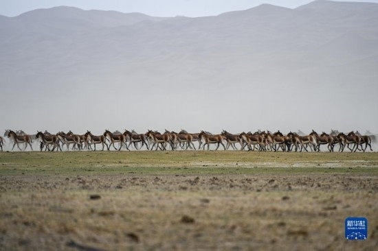 一群藏野驢在阿爾金山國家級(jí)自然保護(hù)區(qū)奔跑(5月23日攝)。