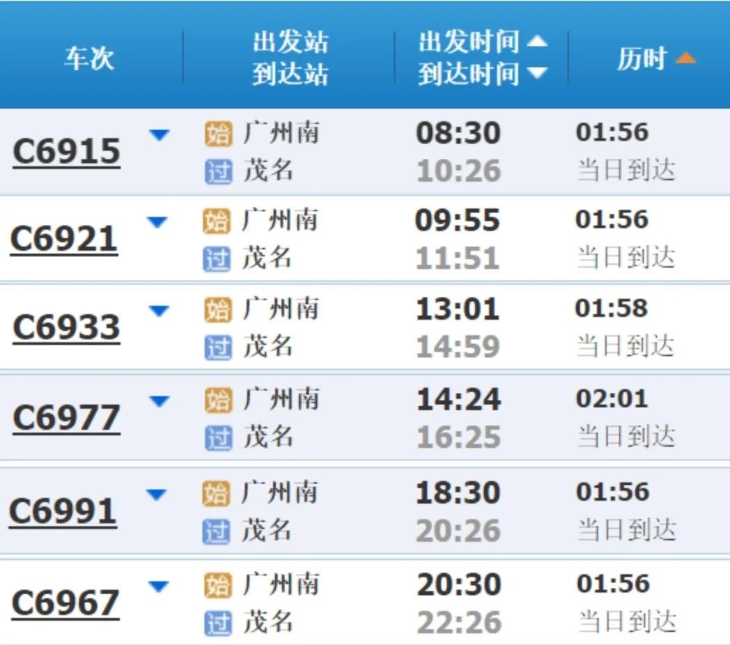 茂名站位于江湛鐵路上,是一個(gè)運(yùn)營城際列車和普速鐵路的混合車站。廣州南至茂名的城際列車日常開行45對(duì),周末增加至52對(duì),將茂名到廣州的旅行時(shí)間縮短至2小時(shí)左右,十分方便。