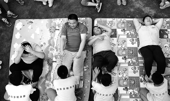 在一個(gè)中小學(xué)超重學(xué)生健康夏令營里,孩子們?cè)谧鲅雠P起坐。何海兒 攝/視覺中國