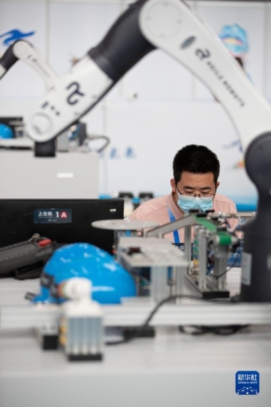 6月6日,選手在進行工業(yè)機器人系統(tǒng)操作員項目比賽。