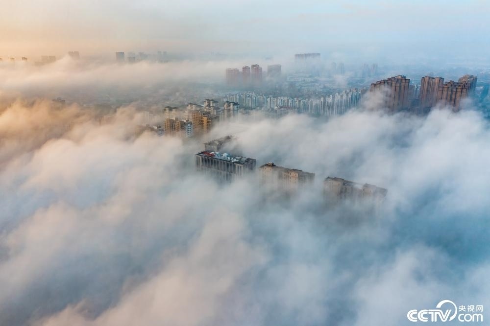 2023年6月11日,江蘇連云港東??h,城市上空云霧繚繞,蔚為壯觀。