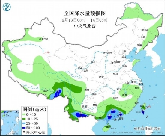 圖2 全國(guó)降水量預(yù)報(bào)圖(6月12日08時(shí)-13日08時(shí)) 圖片來源:中央氣象臺(tái)網(wǎng)站