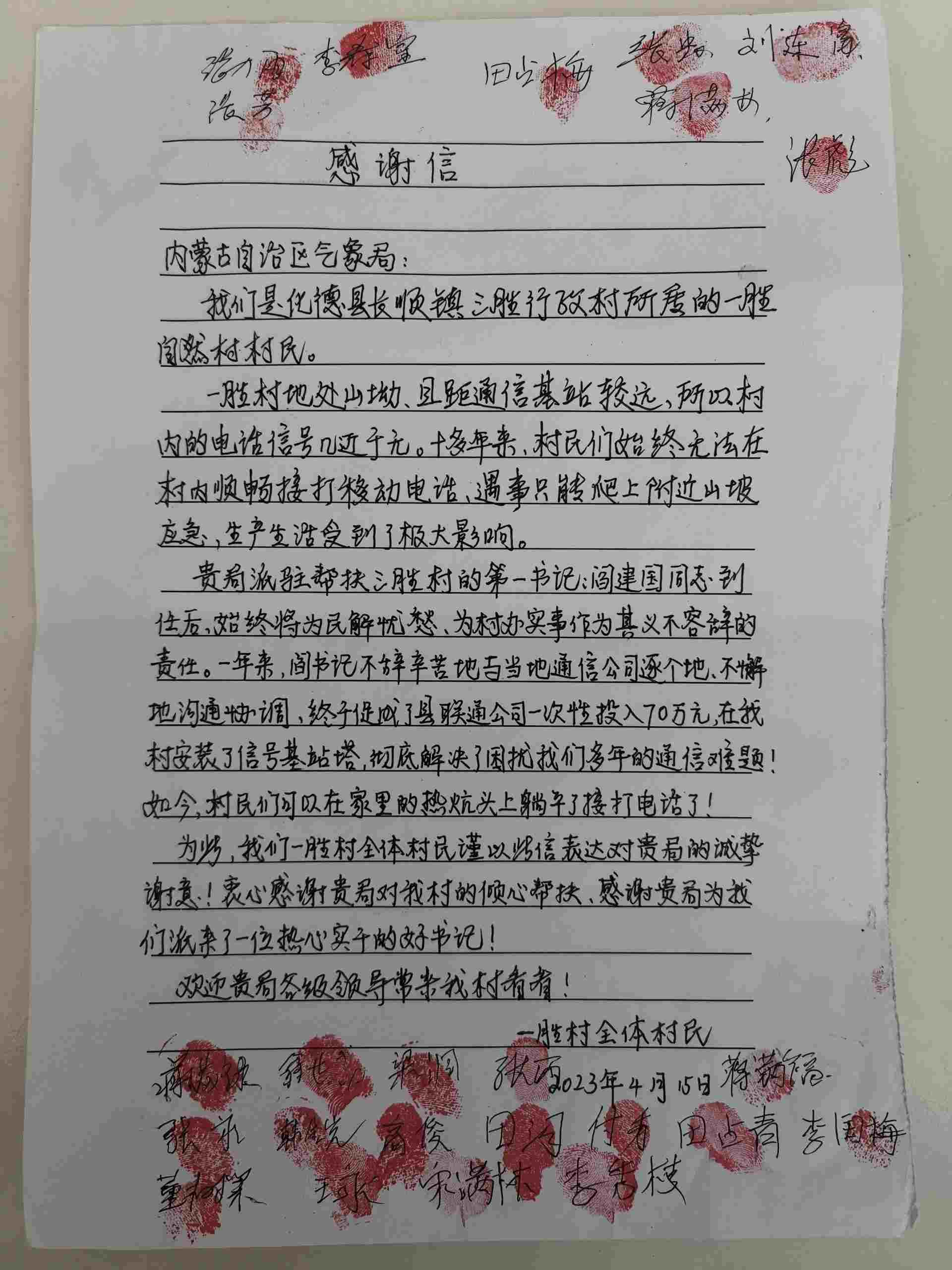近日,一封署名為“一勝村全體村民”的感謝信,被專程送至內(nèi)蒙古氣象局,信紙上的空白處簽滿了24個名字,還有一枚枚鮮紅的指印,這封信承載著烏蘭察布市化德縣一勝村16戶村民對駐村第一書記閻建國的誠摯謝意。