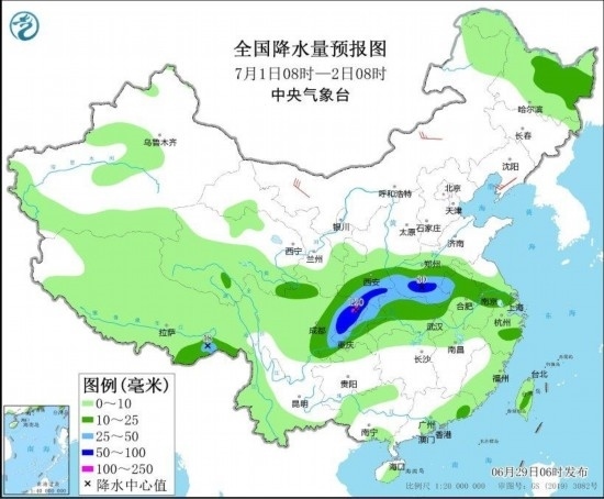 圖1 全國(guó)強(qiáng)降雨落區(qū)預(yù)報(bào)圖(6月29日08時(shí)-30日08時(shí)) 圖自中央氣象臺(tái)網(wǎng)站