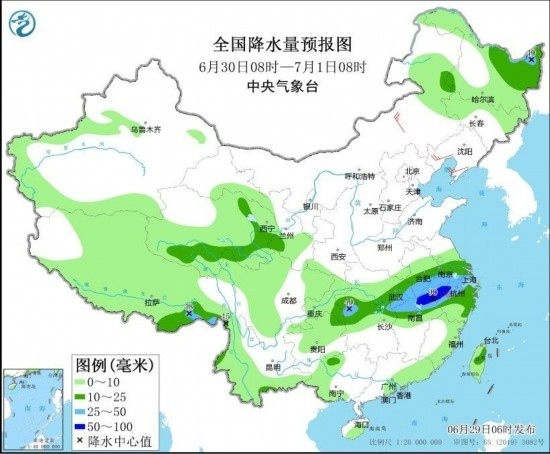 圖4 全國(guó)降水量預(yù)報(bào)圖(6月29日08時(shí)-30日08時(shí)) 圖自中央氣象臺(tái)網(wǎng)站
