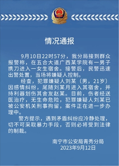 ·廣西外國(guó)語(yǔ)學(xué)院發(fā)生持刀傷人事件,警方通報(bào):進(jìn)女寢持刀傷人男生已被刑拘。