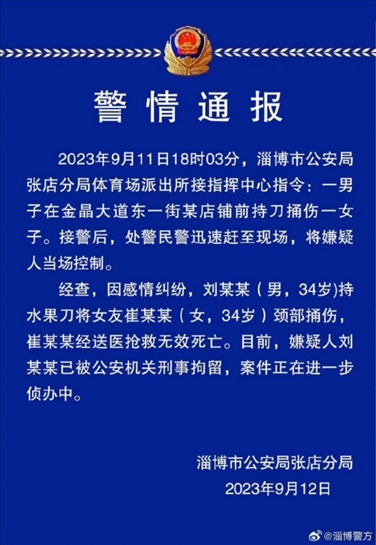 ·淄博警方通報(bào)男子捅傷女友:女子經(jīng)搶救無(wú)效死亡,嫌疑人被刑拘。