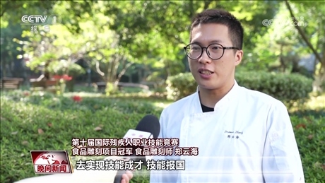 第十屆國際殘疾人職業(yè)技能競賽食品雕刻項(xiàng)目冠軍 食品雕刻師 鄭云海:最近有火炬(傳遞),寓意就是美好、和平,還有吉祥。我想用自己的技能去宣傳我們杭州亞運(yùn)會(huì)的一個(gè)文化。