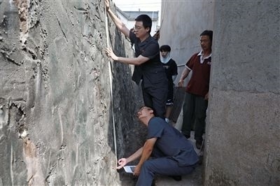 執(zhí)行干警與被執(zhí)行人確認界址。
