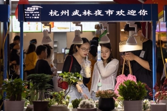 9月29日,人們在杭州西湖邊的武林夜市觀光選購。新華社發(fā)(伊凡 攝)