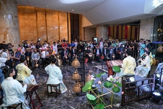 9月29日,嘉賓們在亞奧理事會大家庭總部飯店活動現(xiàn)場欣賞江南絲竹《水鄉(xiāng)蓮韻》表演。新華社記者 陳曄華 攝