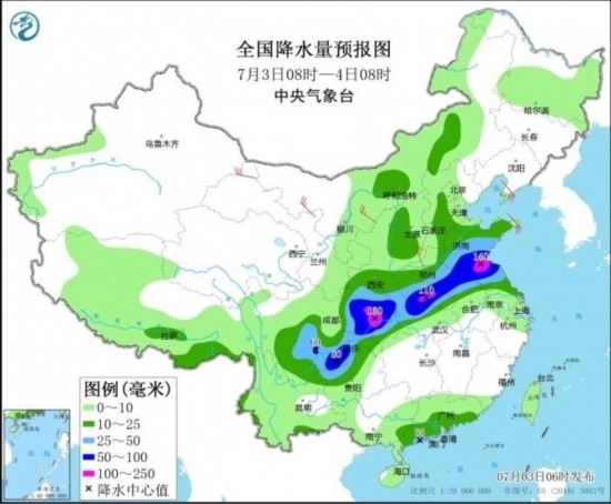 7月3日08時(shí)至4日08時(shí),山東中南部、江蘇北部、安徽北部、河南東部和南部、湖北北部和西部、陜西南部、重慶、四川東部、貴州西北部、云南東北部以及廣東西南部沿海等地部分地區(qū)有大到暴雨,其中,山東南部、江蘇北部、河南南部、重慶北部、四川東北部等地局地有大暴雨(100~160毫米)。內(nèi)蒙古中西部、甘肅中北部、青海北部等地部分地區(qū)有4~6級(jí)風(fēng)。