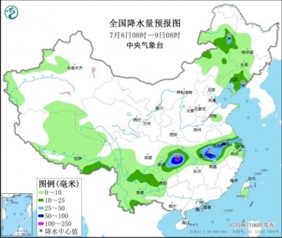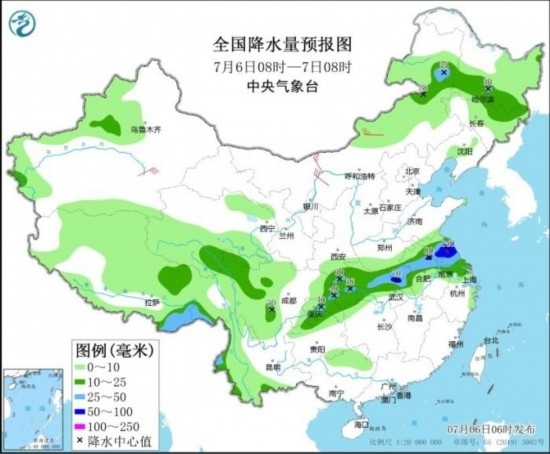 全國降水量預報圖(7月6日08時-7日08時)。圖片來源:中央氣象臺網站