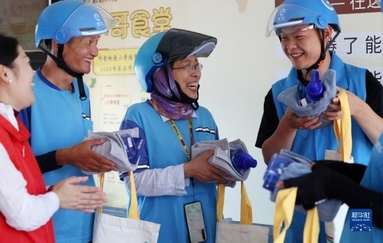7月7日,在山東省臨沂市郯城縣郯城街道一處24小時“等單驛站”,郯城街道社區(qū)工作者為等單的外賣配送員送上毛巾、水杯、防曬袖套等防暑物品。