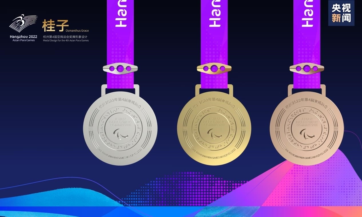 獎牌取名為“桂子”,源自描寫杭州的名句“山寺月中尋桂子”,寓含江南意境和浪漫色彩。系繼會徽“向前”,吉祥物“飛飛”,色彩系統(tǒng)“潤澤”,火炬“桂冠”后又一杭州亞殘運會視覺形象體系的核心元素,是亞殘運文化美學(xué)的重要表達。