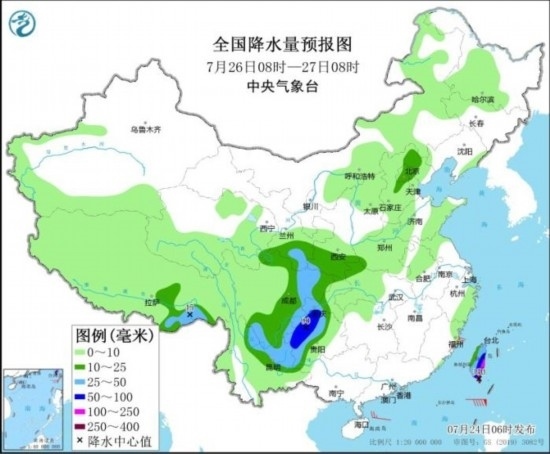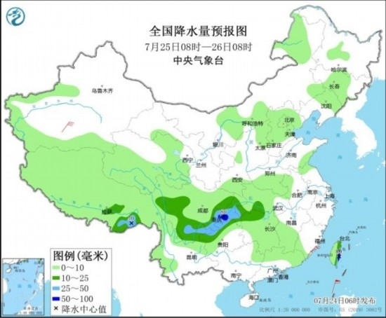 預(yù)計(jì),7月24日08時(shí)至25日08時(shí),四川盆地中南部、重慶大部、貴州北部、云南東北部、湖北西南部、湖南西北部以及浙江南部、福建中北部、江西南部、黑龍江北部、西藏東部等地部分地區(qū)有大到暴雨,其中,重慶南部等地局部地區(qū)有大暴雨(100~140毫米)。上述部分地區(qū)伴有短時(shí)強(qiáng)降水(最大小時(shí)降雨量30~50毫米,局地可超過(guò)70毫米),局地有雷暴大風(fēng)等強(qiáng)對(duì)流天氣。中央氣象臺(tái)7月24日06時(shí)繼續(xù)發(fā)布暴雨藍(lán)色預(yù)警。