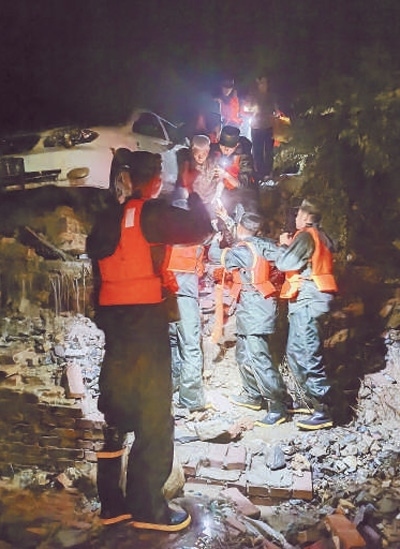 因暴雨引發(fā)山體滑坡,北京市門頭溝區(qū)妙峰山鎮(zhèn)水峪嘴村大量房屋被沖垮。武警北京總隊機(jī)動某支隊分散摸排村莊、搜救傷員。經(jīng)過22個小時持續(xù)奮戰(zhàn),轉(zhuǎn)移受災(zāi)村民107人,轉(zhuǎn)運村民物資財產(chǎn)1100余件。
