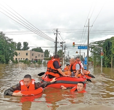 7月31日,武警北京總隊官兵在北京市房山區(qū)轉(zhuǎn)移被困群眾。當(dāng)日,共轉(zhuǎn)移6個村莊被困群眾676人,協(xié)助轉(zhuǎn)運物資1000余件。李卓爾 王 斌攝影報道