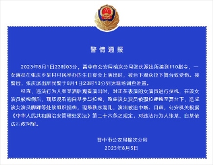 ·山西晉中警方通報(bào)女演員被觀眾拉下舞臺(tái)致傷:兩人被行拘。