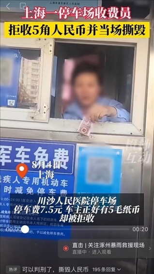 ·上海一醫(yī)院停車場(chǎng)收費(fèi)人員拒收5角紙幣并撕毀,被行政處罰。