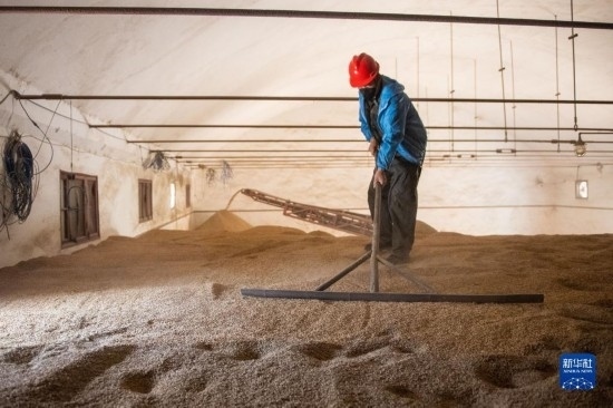 8月7日,在湖南安仁國家糧食儲備庫,工作人員在抽檢運輸帶上的糧食品質。