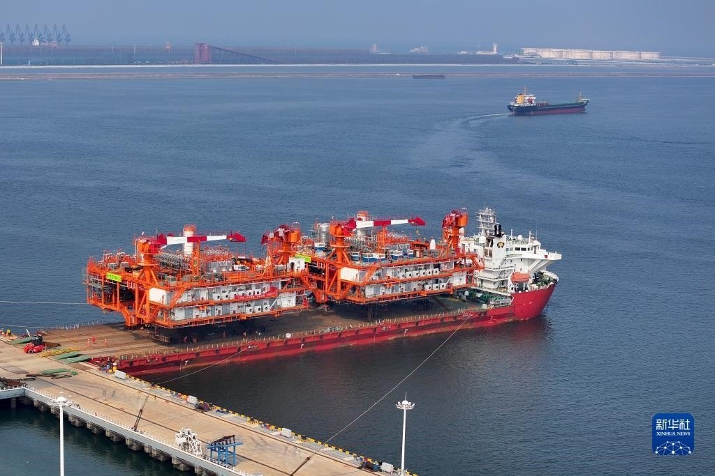這是8月9日在天津?yàn)I海新區(qū)拍攝的渤中19-6凝析氣田I期開發(fā)項(xiàng)目組塊裝船作業(yè)現(xiàn)場(chǎng)。組塊裝船后將赴渤海西部海域,進(jìn)入海上安裝和聯(lián)調(diào)階段。