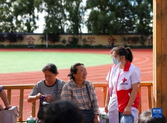 8月11日,在吉林省舒蘭市舒蘭三中居民安置點(diǎn),舒蘭市紅十字會(huì)工作人員與安置點(diǎn)居民聊天。