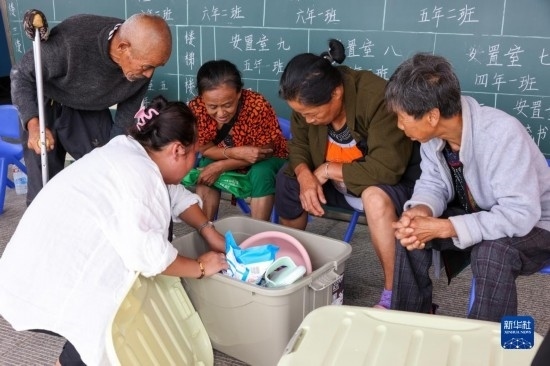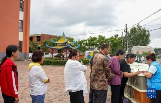 8月11日,居民在吉林省舒蘭市舒蘭三中居民安置點(diǎn)領(lǐng)取舒蘭市紅十字會(huì)發(fā)放的藥品物資。