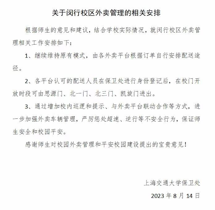 8月14日晚6點(diǎn),有上海交大學(xué)生向記者反映,學(xué)校已更新關(guān)于閔行校區(qū)外賣管理的相關(guān)安排。安排顯示,維持原有模式,由各外賣平臺根據(jù)訂單自行安排配送途徑,各平臺認(rèn)可的配送人員在保衛(wèi)處進(jìn)行身份登記后,在校門開放時段可由學(xué)校四個校門進(jìn)出;學(xué)校會通過增加校內(nèi)巡邏和提示,與外賣平臺聯(lián)動合作等方式,進(jìn)一步加強(qiáng)外賣車輛管理,嚴(yán)厲懲處超速、逆行等不安全行為,保證師生安全和校園平安。當(dāng)晚,澎湃新聞記者了解到,閔行校區(qū)已有保安人員接到上級通知,維持原有模式,多名外賣騎手也從學(xué)校保安人員處獲知可正常進(jìn)出校園。