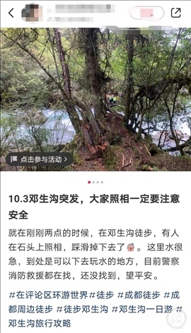 10月3日,游客艾女士(化名)發(fā)布圖片稱,當(dāng)天下午2點(diǎn)左右,在鄧生溝徒步,有人照相時(shí)踩滑掉落水里,水流非常湍急?!笆钦驹谑^上照相,踩滑了掉下去。聽到落水者兒子哭著給家里人打電話說的?!彼€向上游新聞?dòng)浾弑硎?,落水者是一位女游客,事情發(fā)生后,警方、消防等都在展開救援。多位游客表示,該女游客已被找到,不過已經(jīng)去世。