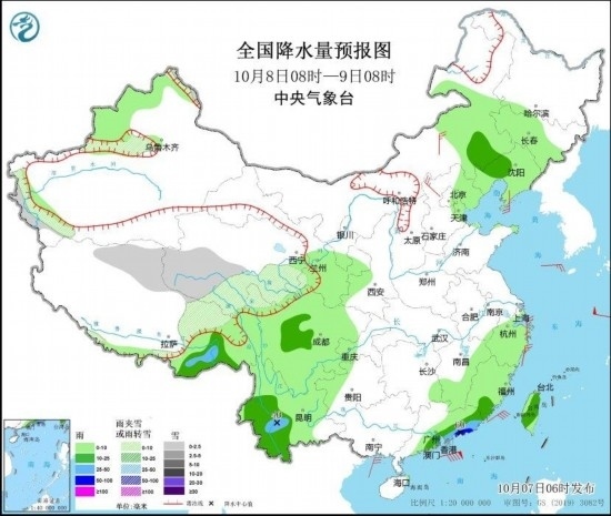圖1 全國降水量預(yù)報(bào)圖(10月7日08時(shí)-8日08時(shí))
