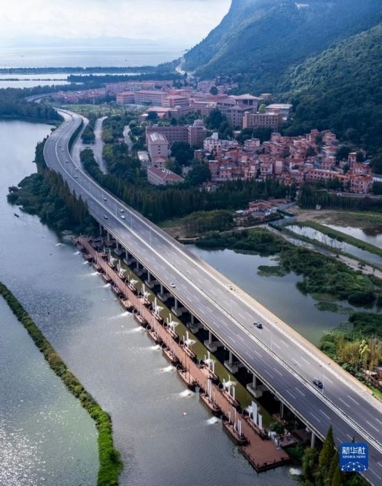 這是10月6日拍攝的位于高速公路橋下的滇池綠道草海段鋼浮橋(無人機(jī)照片)。