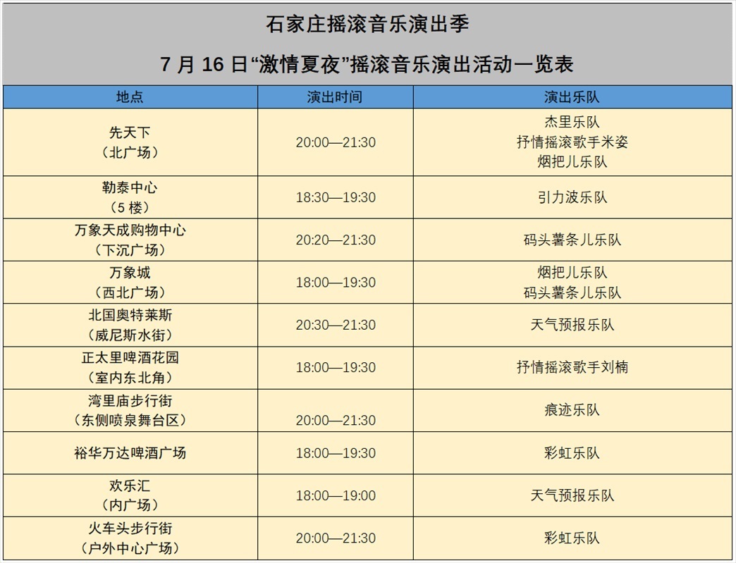 當(dāng)?shù)孛襟w早前報道稱,9月16日至24日,由河北省商務(wù)廳、石家莊市人民政府聯(lián)合主辦的河北·澳門美食音樂消費(fèi)節(jié)暨河北金秋消費(fèi)季活動在石家莊舉辦?;顒庸舶厣朗彻?jié)、音樂休閑節(jié)、激情購物節(jié)三個板塊。其中,音樂休閑節(jié)于每天18時30分至22時30分在石家莊正太廣場舉辦。十余位歌手、6支樂隊(duì)帶來精彩的音樂演出,豐富市民游客文化體驗(yàn),演出曲目風(fēng)格包含搖滾、民謠、爵士、抒情等。