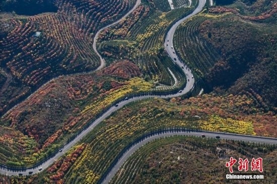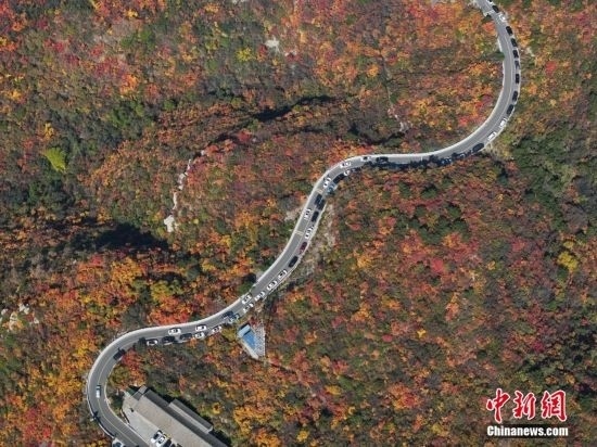 10月15日,航拍山西省太原市天龍山網(wǎng)紅橋秋景絢麗。近日,天龍山迎來秋景最佳觀賞期。中新社記者 武俊杰 攝