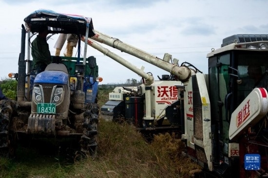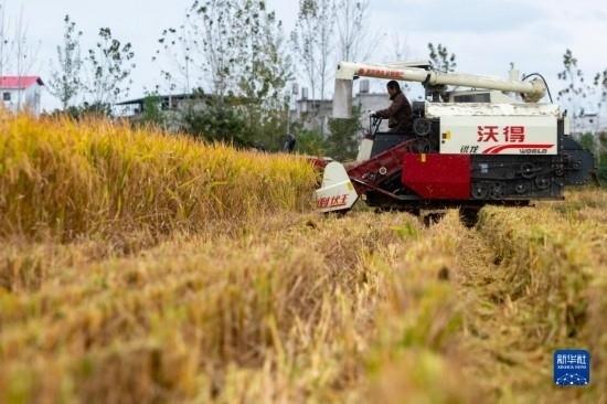 在湖北省天門(mén)市石家河鎮(zhèn)唐店村,農(nóng)民操作農(nóng)機(jī)收割水稻(10月19日攝)。