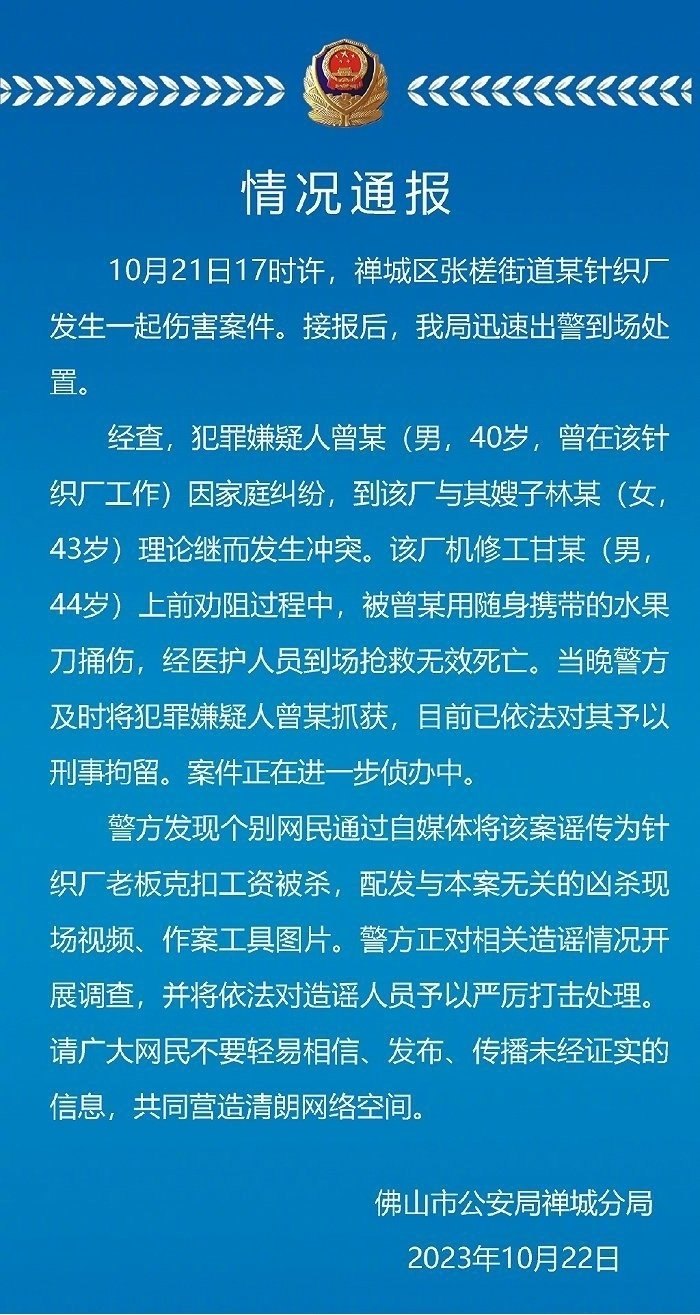 ·廣東警方辟謠網(wǎng)傳老板克扣工資被殺:男子因家庭糾紛與嫂子起沖突,該廠機修工勸阻中被捅傷致死。