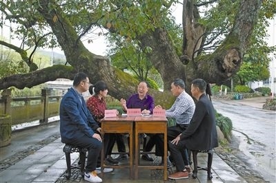 圖①:巡回審判。圖為諸暨法院法官在東溪村百年古樟樹下開展巡回審判,依法對兩起非法狩獵的刑事案件進行公開審理并當庭宣判。