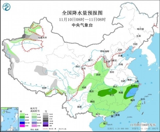 11月10日08時至11日08時,新疆沿天山地區(qū)和南疆西部山區(qū)、山西中部等地部分地區(qū)有小到中雪或雨夾雪,局地大雪。西北地區(qū)東南部、江漢西部、江南、西南地區(qū)東部、華南、臺灣島等地部分地區(qū)有小到中雨,其中,浙江中南部、福建北部等地部分地區(qū)有大雨。遼東半島、山東南部等地部分地區(qū)有4~5級風(fēng)(見圖4)。