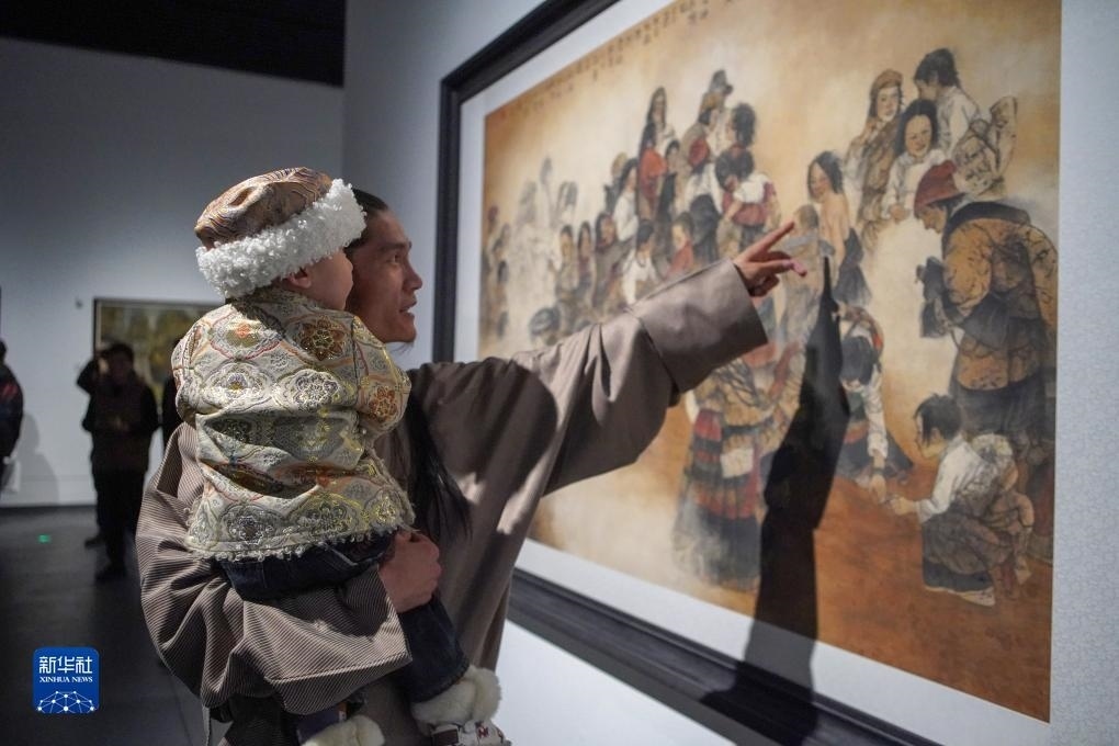 11月15日,觀眾在西藏美術(shù)館參觀畫作《草原紀(jì)事》。 新華社記者 邵澤東 攝