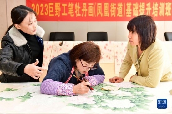 12月2日,在巨野縣鳳凰街道鳳麟社區(qū),來自巨野書畫院的畫師魏蘭蘭(左一)在工筆牡丹畫基礎(chǔ)提升培訓(xùn)班上指導(dǎo)學(xué)員作畫。