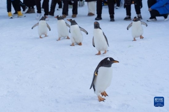 時(shí)值周末,哈爾濱極地公園的企鵝亮相戶外,上演冰雪巡游,吸引許多游客前來(lái)觀賞。目前正是黑龍江省哈爾濱市的冰雪旅游季。
