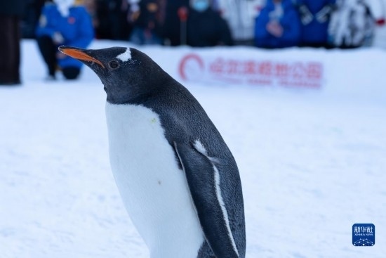 12月3日,在哈爾濱極地公園戶外冰雪巡游的企鵝吸引游客圍觀。