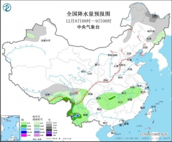 全國降水量預(yù)報圖(12月8日08時-9日08時)