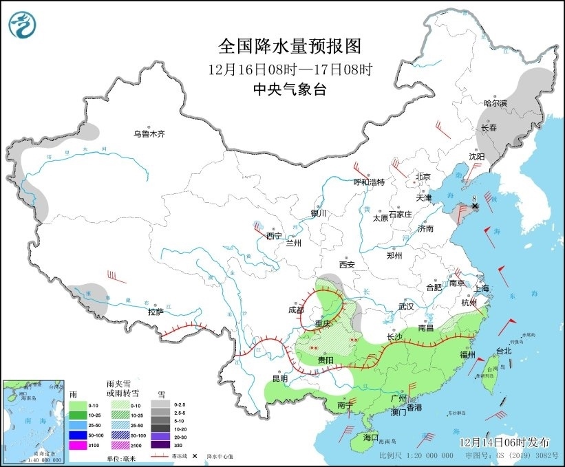 12月16日08時(shí)至17日08時(shí),新疆南疆西部山區(qū)、黑龍江東部、吉林大部、遼寧東北部和遼東半島、山東半島、重慶東部、貴州中北部等地部分地區(qū)有小到中雪或雨夾雪,其中,山東半島北部等地部分地區(qū)有大雪(5~8毫米)。貴州等地局地有凍雨。江南中南部、四川盆地東部、華南大部等地部分地區(qū)有小雨。內(nèi)蒙古中東部、遼東半島、華北北部、山東半島、江南東部、華南沿海地區(qū)等地部分地區(qū)有4~6級風(fēng)(見圖7)。