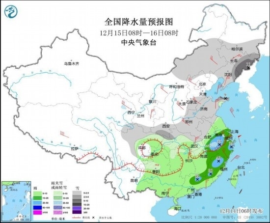 12月14日至15日,中東部地區(qū)有大范圍雨雪天氣過程,西北地區(qū)中東部、內(nèi)蒙古、華北、黃淮中北部、遼寧、吉林有小到中雪,其中陜西南部、華北南部、黃淮北部、遼寧東部、吉林東部等地的部分地區(qū)有大到暴雪,局地大暴雪或特大暴雪;陜西南部、河南、山東中部、湖北西部和東北部、安徽西部等地部分地區(qū)有凍雨;黃淮南部、江淮、江漢、重慶及江南等地有中到大雨,局地暴雨,部分地區(qū)伴有高架雷暴。