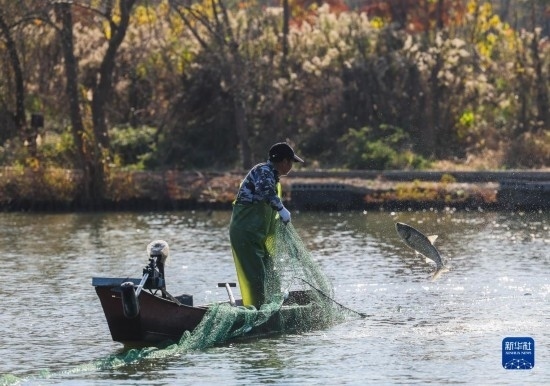 12月14日,在諸暨市白塔湖國(guó)營(yíng)漁場(chǎng)的水域內(nèi),漁民在放網(wǎng)捕魚(yú)。