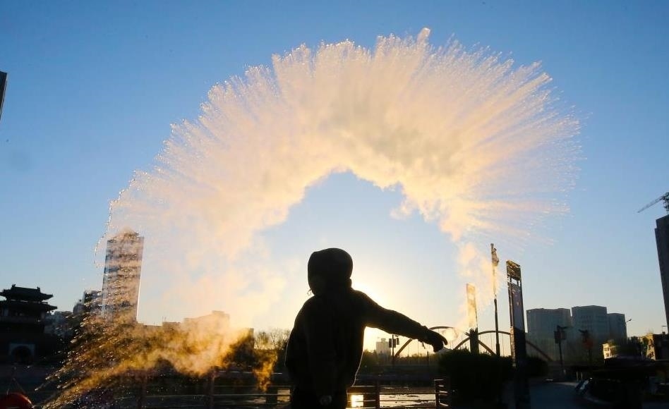 12月16日清晨,山東濰坊室外氣溫零下11攝氏度,市民在戶外體驗(yàn)“潑水成冰”。